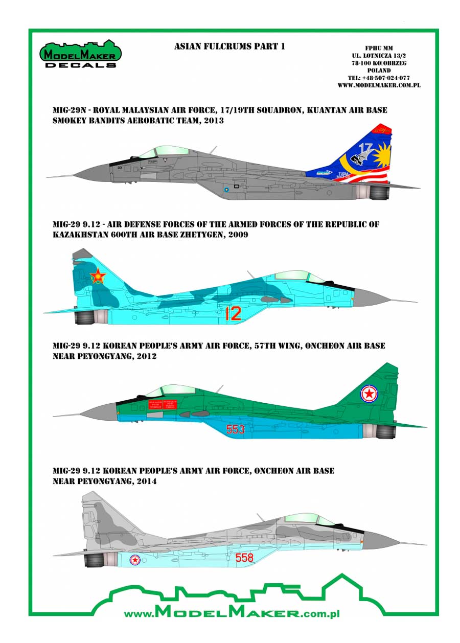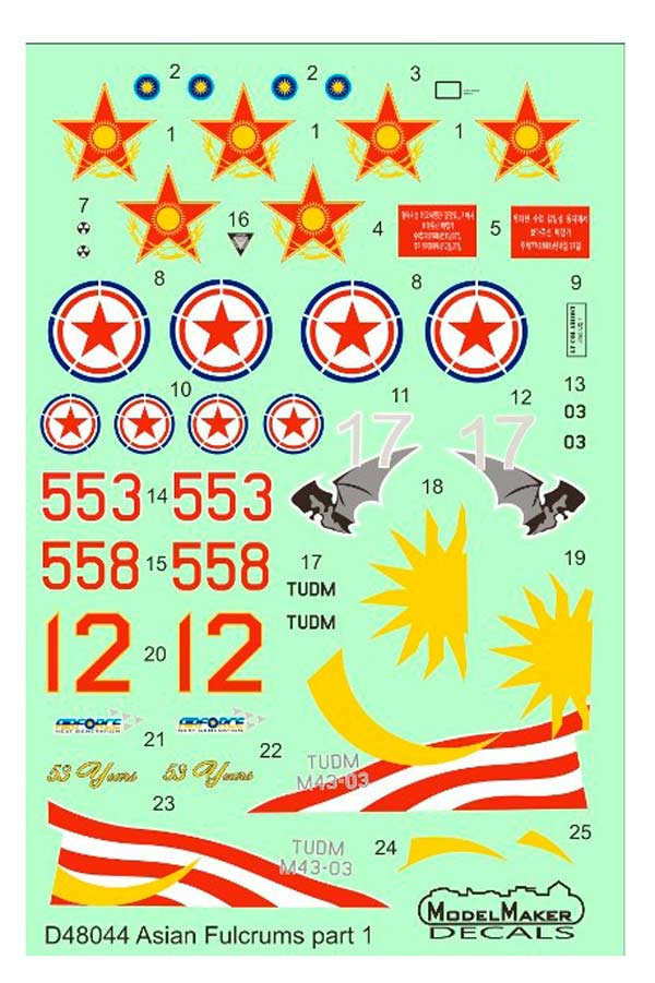 Set de calcas de Model Maker Decals a escala 1/48 para los MiG-29 Fulcrum de paises asiáticos. Contiene calcas para 4 aparatos.