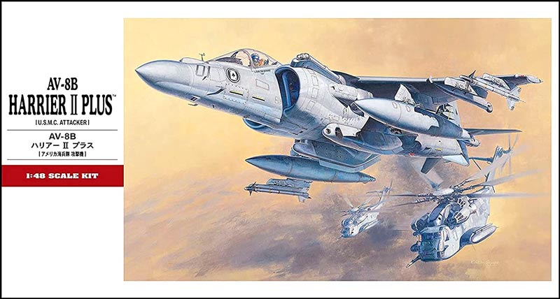 Maqueta a escala 1/48 del AV-8B HArrier II Plus de Hasegawa. Contiene calcas para 2 aparatos.