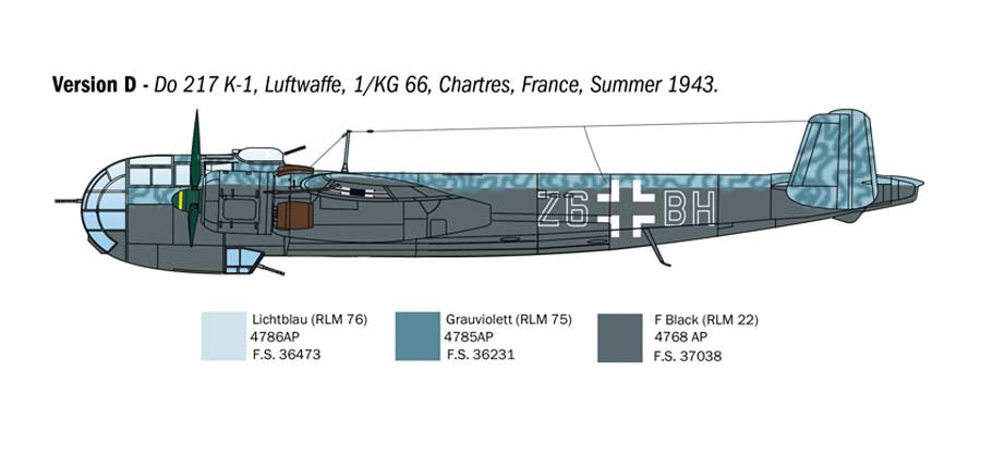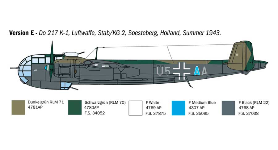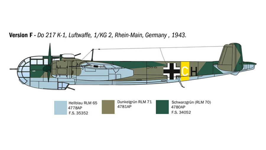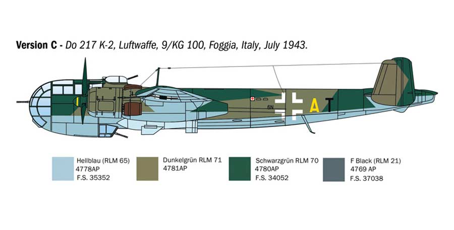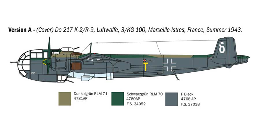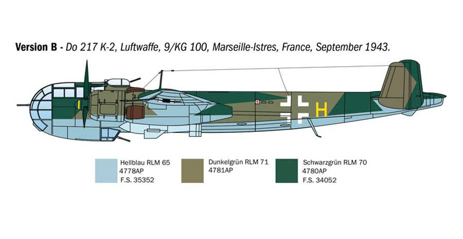 Maqueta a escala 1/72 de Italeri del Dornier Do217 K-1/ K-2 con la bomba guiada Fritz X. Contiene calcas para 6 aparatos.