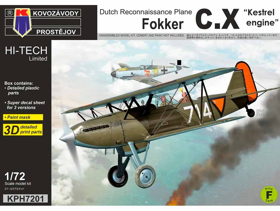 Maqueta a escala 1/72 de Kovozadovy Prostejov del Fokker C.X Kestrel Engine. Contiene calcas para tres aparatos. Modelo españolizable puesto que estuvo en las filas de la aviación de la república. Contiene mascarillas y piezas en 3D.