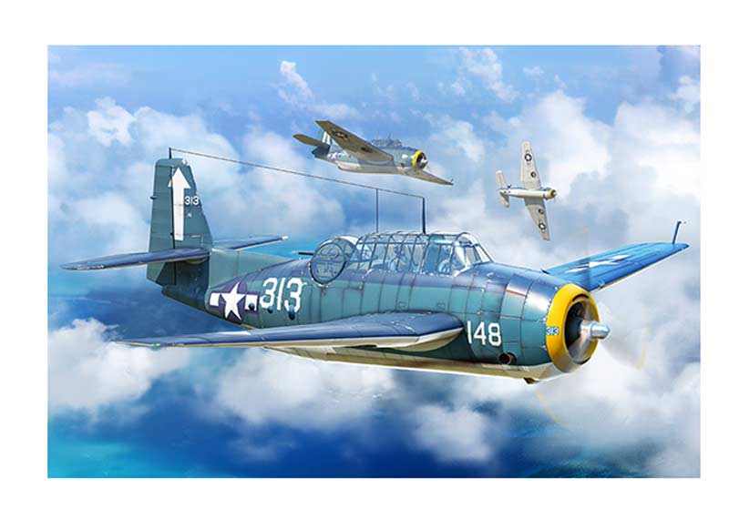 Maqueta a escala 1/72 de Hobbyboss del Graumman TBM-3 Avenger. Nuevo molde. Contiene mascarillas y calcas para dos aparatos.