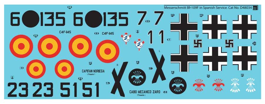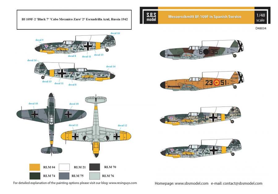 Hoja de calcas a escala 1/48 de SBS model para el Bf 109 F en servicio en España. Contiene calcas para 4 aparatos.