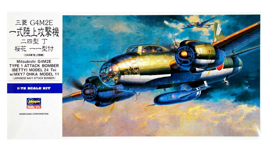 Maqueta a escala 1/72 del Mitsubishi G4M2E betty de HAsegawa. Contiene calcas para 2 aparatos.. Segundo molde de la maqueta con panelado inciso creado en los años 90, no es el de los setenta.