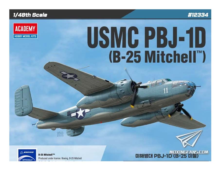 Maqueta a escala 1/48 de Academy del PBJ-1D, versión de la US NAvy del famoso B-25 Mitchell. Contiene mascarillas y calcas para 6 aparatos. Molde original de Accurate Miniatures.