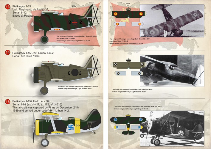Contiene calcas para 15 aparatos, 4 Republicanos y 3 en las filas Nacionales durante la Guerra Civil Española.