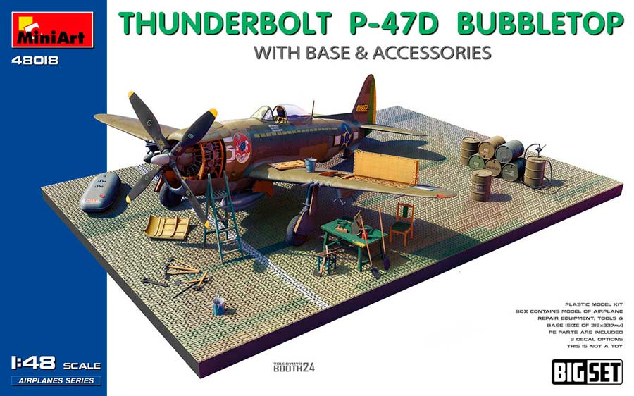 Maqueta a escala 1/48 del P-47 D Bubbletop de Mi niart a escala 1/48. Nuevo molde. La maqueta viene acompañada de una base con sus accesorios como se puede ver en el boxart. La base y los accesorios se han de montar y pintar al igual que la maqueta del P-47 D.