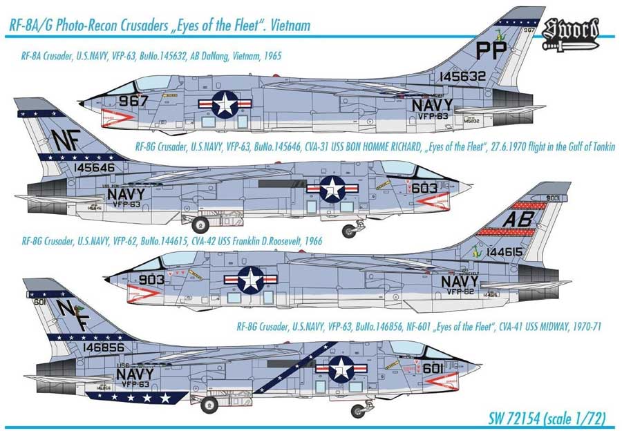 Maqueta a escala 1/72 de Sword del RF-8 A/G Crusader. Nuevo molde. Variante de fotoreco del Crusader. Contiene calcas para cuatro aparatos y mascarillas.