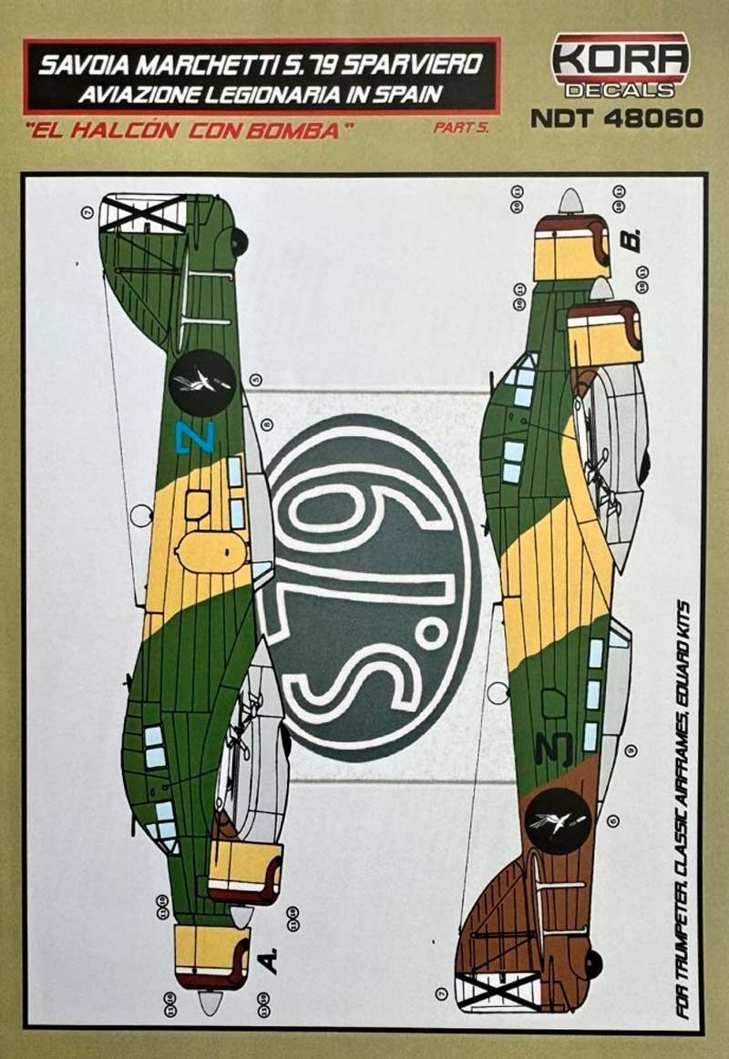 Set de calcas a escala 1/48 de Kora Models para los Sm 79 Sparviero de la Aviazione Legionaria durante la Guerra Civil Española. Contiene calcas para dos aparatos de el halcón con bomba.