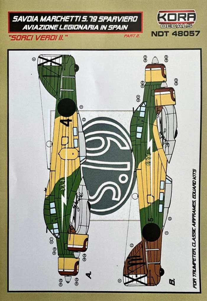Set de calcas a escala 1/48 de Kora Models para los Sm 79 Sparviero de la Aviazione Legionaria durante la Guerra Civil Española. Contiene calcas para dos aparatos del Angelito con bomba.