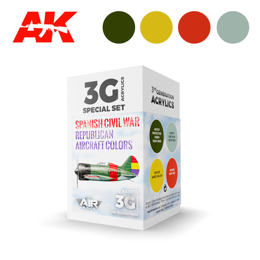 Set de AK Interactive de colores acrílicos de 3ª generación para aviones republicanos durante la Guerra Civil Española. Contiene 3 colores.