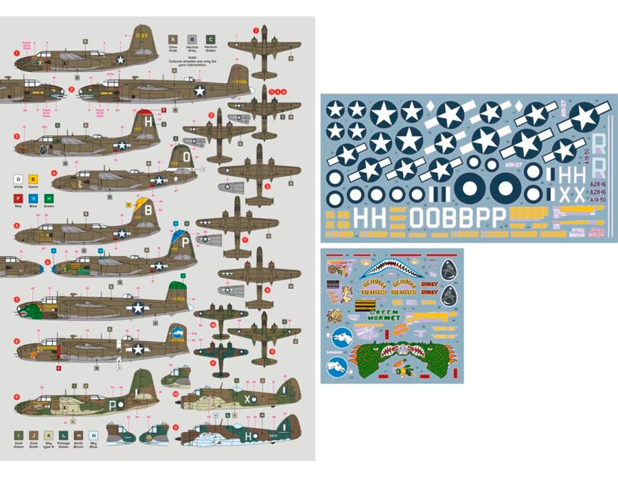 Set de calcas a escala 1/72 de DK Decals para diferentes bimotores de apoyo al suelo de los aliados en Nueva Guinea. Contiene calcas para 11 aparatos.