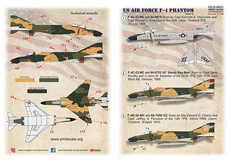 Set de calcas a escala 1/48 de Print Scale para los F-4 Pahntom en servicio con el US Air Force durante la Guerra de Vietnam. Contiene calcas para 3 aparatos. VAriantes C y D.