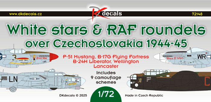 Set de calcas a escala 1/72 de DK Decals sobre aparatos de la USAF y la RAf sobre Checoslovaquia en el 1944-45. Contiene calcas para ocho aparatos.